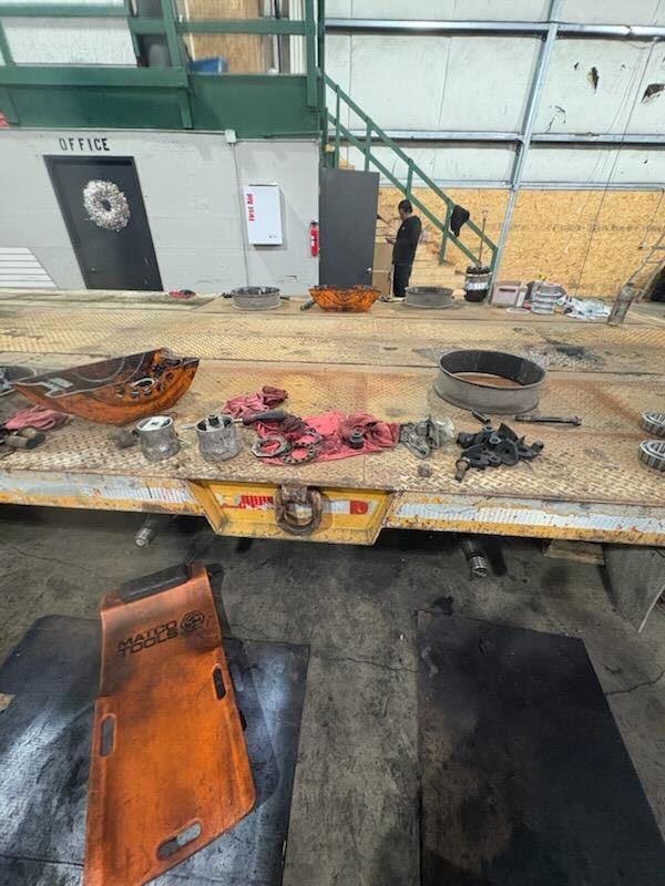 This trailer arrived needing extensive service, far more than a quick alignment or tire adjustment. Our technicians performed a complete teardown, including wheel-end disassembly, component inspection, replacement of worn suspension parts, and preparation for a full heavy truck alignment once all repairs are complete.